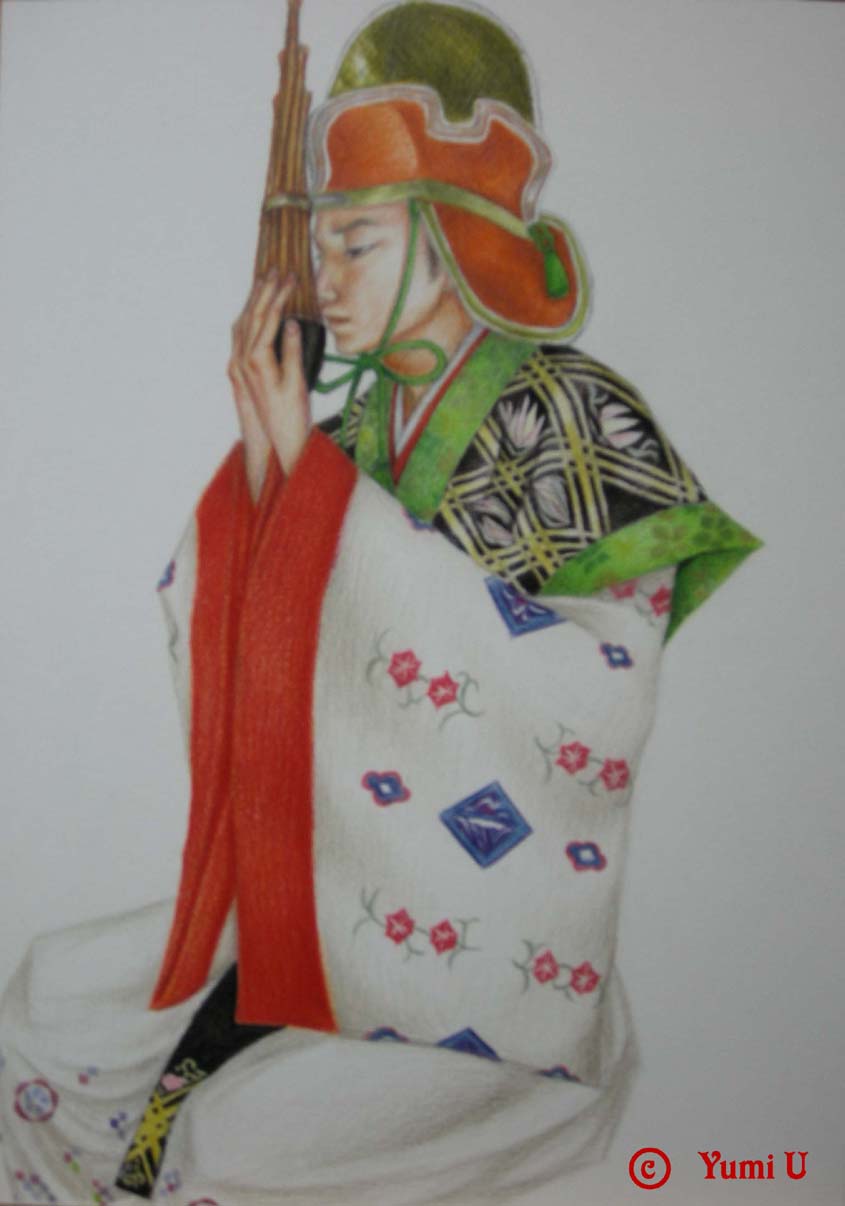 特に舞楽の時の楽師の衣装が、私的にはすごくツボだったので、絵を描いてしまいました。なんていうか、色の重ねとか、服が翻ったときに見える色とか刺繍とか・・・すごくキレイで・・・。笙の演奏している姿ってなんだか、色気があるなぁと思ったり(・・・こんな視点でみてしまい申し訳ないですが。↑上の絵はこの笙を演奏している様子を描いてみました。・・・画力が足らず表現しきれてませんが・・!(汗))。篳篥も「ひちりき」という名前自体がまた美しいですし・・・。大きな太鼓??を演奏している姿とかがすごく凛々しさがあり、音も迫力があって素敵でしたし。